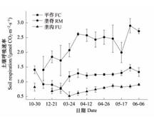 利用Q-BOX SR1LP土壤呼吸作用測量系統在樣地進行不同測量點的測量,然后在設置的時間段取平均值作為該時間段的呼吸值。利用儀器提供的由呼吸值轉換為呼吸速率的公式對數據進行處理,獲得每個采樣點的土壤呼吸速率。