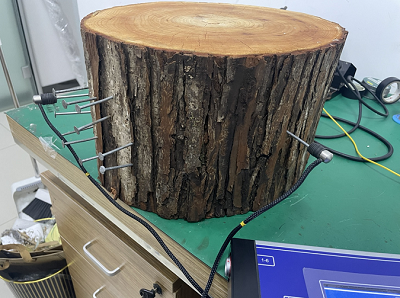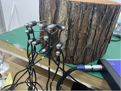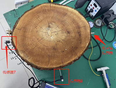 第三步:將12個傳感器分布布置在12顆測量釘上,電子錘的敲擊釘布置在另一側的測量釘上,打開電子錘敲擊,將測量序號調至13,敲擊產生應力波,觀察各個傳感器的柱狀圖顯示;