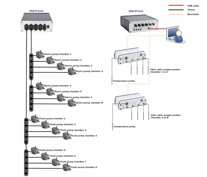該系統基于光纖傳感技術,由軟件和硬件設備組成,能在八個任意大小、形狀、體積的呼吸室里自動測量動物對氧的消耗率。還可兼容測量水溫的設備以及實時補償氧氣值軟件。需要針對實驗動物對象配備合適的試驗呼吸室chambers,以及匹配的8個光纖袖珍氧氣傳感器。